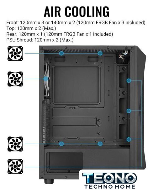 | Конфигурация вентиляторов | Передняя панель: 120 мм x 3 или 140 мм x 2 (Вентиляторы 120 мм FRGB включены x 3)Верхняя панель: 120 мм x 2 (Макс.)Задняя панель: 120 мм x 1 (Вентиляторы 120 мм FRGB включены x 1)Кожух блока питания: 120 мм x 2 (Макс.) |