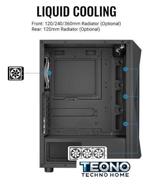 | Расположение СЖО | Передняя панель: 120/240/360 мм радиатор (Опционально)Задняя панель: 120 мм радиатор (Опционально) |