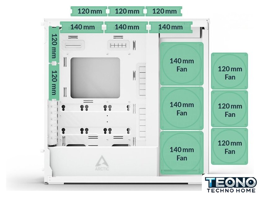 | Расположение вентиляторов | сверху:3x120 мм или 3x140 ммсбоку:3x120 мм или 3x140 ммсзади:2x120 ммустановленысбоку:3x140 ммсзади:2x120 мм |