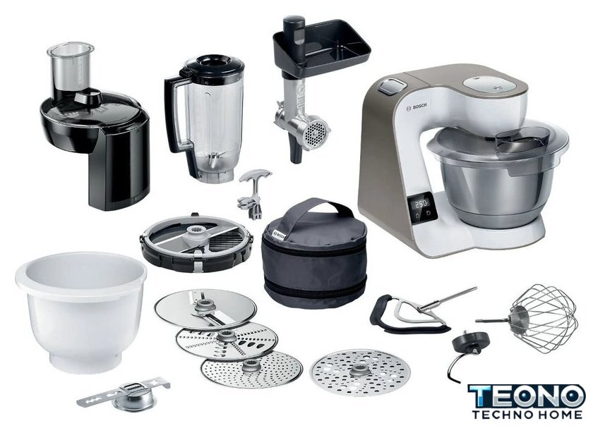 | Полная комплектация | насадка для смешивания с силиконовым покрытием, насадка для взбивания, крюк для замешивания, 4 сменных диска из нержавеющей стали (6 функций): реверсивный диск для нарезки ломтиками (крупная и мелкая), реверсивный диск для нарезки ломтиками (крупная и мелкая), диск для мелкой терки и диск для нарезки картофеля драниками, чаша блендера 1.25л, Cube Cutter: насадка для нарезки овощей, фруктов и мяса ровными кубиками, формирователь печенья, пластиковая чаша, прозрачная крышка чаши для защиты от брызг, мясорубка, кейс для хранения оборудования |