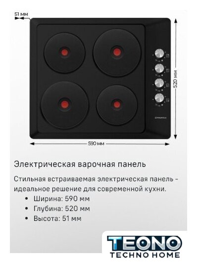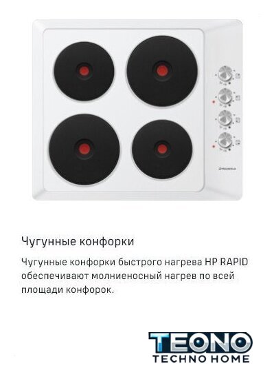 Подробная информация о конфорках | Мощность конфорок, Вт.: 1500, 1500, 1500, 1500 |
