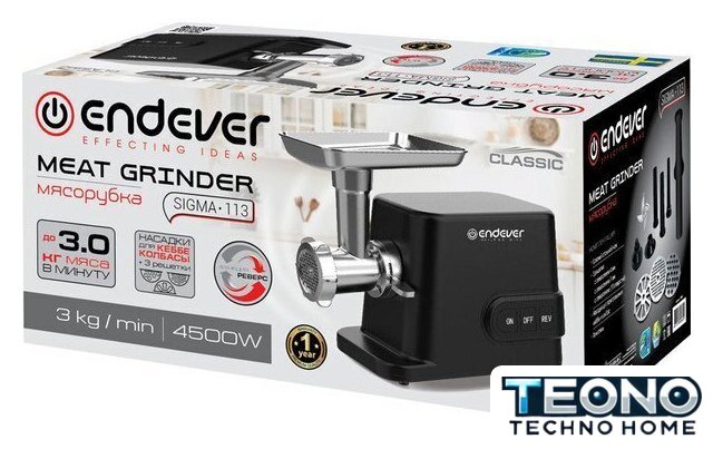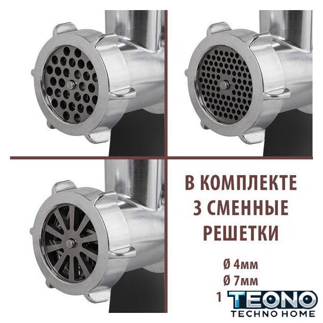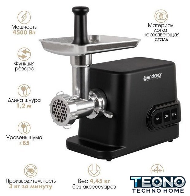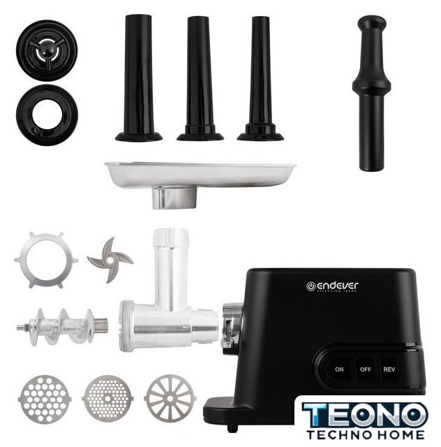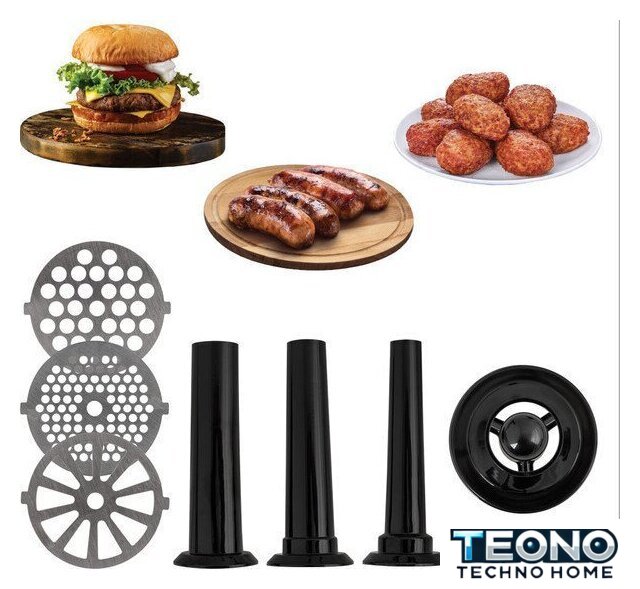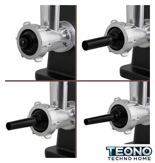 | Полная комплектация | мясорубка, металлический загрузочный лоток, нож, толкатель, фиксирующая гайка, шнек, 3 формовочных диска, насадки для кеббе и домашней колбасы, инструкция |