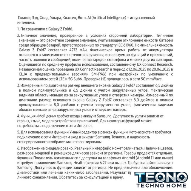 | Отличия от предыдущего поколения | ✅ В Galaxy Z Fold7 реализовано несколько инноваций, которые отличают его не только от Galaxy Z Fold6, но и от любого другого складного смартфона на рынке. Во-первых, широкие дисплеи как внутри, так и снаружи. Диагональ внешнего экрана теперь составляет 6.5 дюйма, а основной экран имеет впечатляющую диагональ 8 дюймов с более широким соотношением сторон, что обеспечивает более плавную работу в многозадачном режиме.✅ И хотя дисплеи стали больше, сам смартфон значительно уменьшился в размерах и стал более портативным, чем все предыдущие Galaxy Z Fold, как в сложенном, так и в раскрытом виде. В раскрытом виде его толщина составляет 4.2 мм, а в сложенном — 8.9 мм, что делает его примерно на 25% тоньше Galaxy Z Fold6.✅ В сложенном состоянии экран Galaxy Z Fold7 имеет соотношение сторон 21:9, аналогичное соотношению сторон у премиальных смартфонов моноблокового типа. Такое улучшенное соотношение сторон обеспечивает удобство и естественность набора текста, а также повышает производительность. |