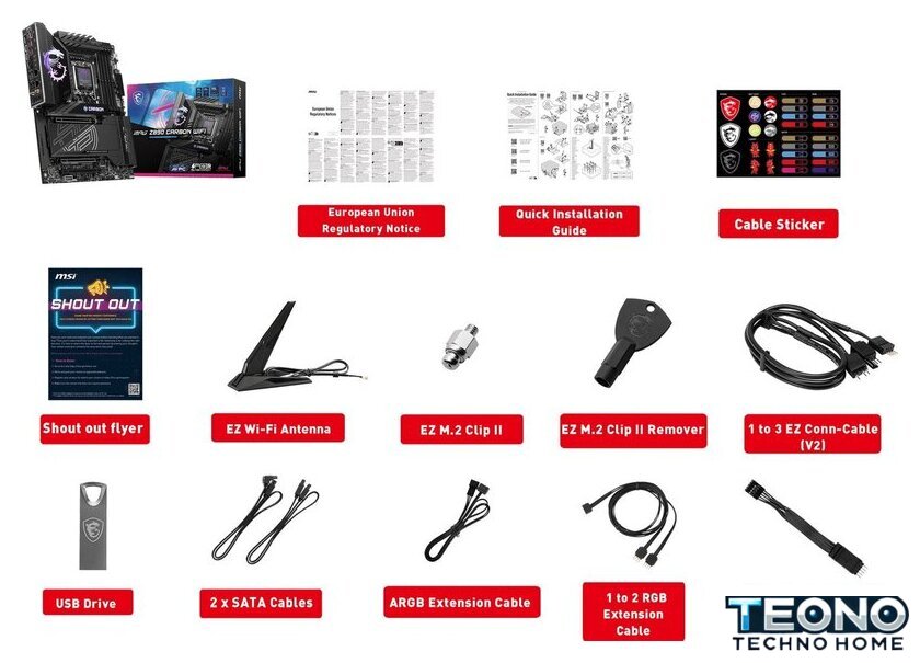 | Комплектация | - EZ Wi-Fi антенна - USB Flash накопитель - стикеры для кабелей- 2 кабеля SATA- EZ кабель фронтальной панели- 1EZ - 3EZ кабель - 1RGB - 2RGB кабель-удлинитель - ARGB кабель-удлинитель- ключ-экстрактор EZ M.2 Clip II - винт со стойкой EZ M.2 Clip II- документация |