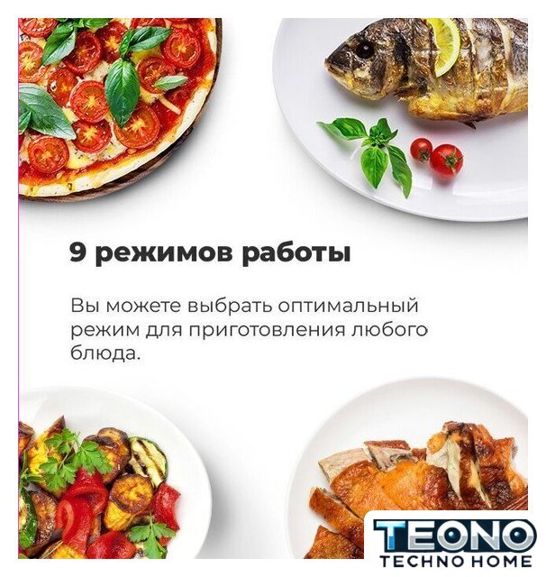 | Режимы работы | нижний нагрев, двухсторонний нагрев, большой гриль, гриль + конвекция, двухсторонний нагрев + конвекция, размораживание |