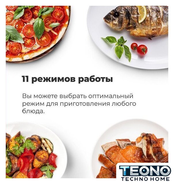 Режимы работы | нижний нагрев, двухсторонний нагрев, большой гриль, вентиляционный нагрев, гриль + конвекция, нижний + вентиляционный нагрев, двухсторонний нагрев + конвекция, размораживание, предварительный разогрев духовки, подготовка теста |