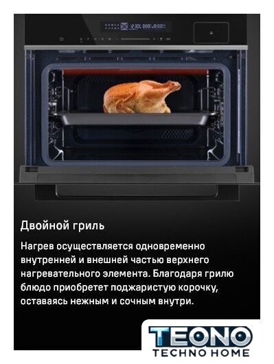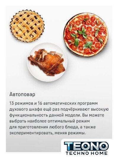 Режимы работы | нижний нагрев, двухсторонний нагрев, большой гриль, гриль + конвекция, нижний нагрев + конвекция, двухсторонний + вентиляционный нагрев (3D), размораживание |
