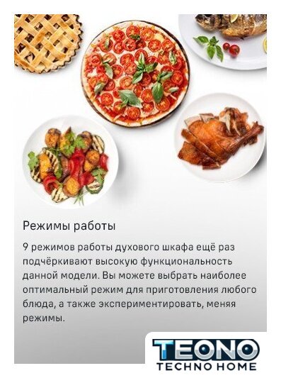 Режимы работы | нижний нагрев, двухсторонний нагрев, большой гриль, вентиляционный нагрев, гриль + конвекция, двухсторонний нагрев + конвекция, размораживание |