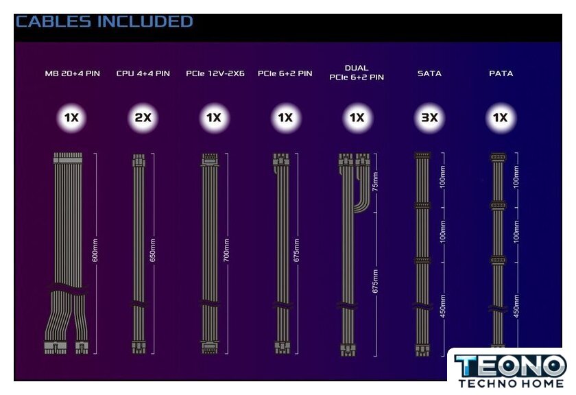 | Комплектация | - кабель питания материнской платы 24 pin- два кабеля процессора 4+4 pin- два кабеля PCIe 6+2 pin- один кабель PCIe Gen5 12V-2x6- кабель 4-pin Peripheral- три кабеля SATA |