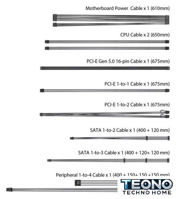 | Комплектация | Power Cord x 1Motherboard Power Cable x 1 (610mm)CPU Cable x 2 (650mm)PCI-E Gen 5 16-pin Cable x 1 (675mm)PCI-E (16-pin to 8-pin-8-pin) Cable x 1 (675mm)PCI-E 1-to-1 Cable x 1 (675mm)SATA 1-to-2 Cable x 1 (400+120mm)SATA 1-to-3 Cable x 1 (400+120+120mm)Peripheral 1-to-4 Cable x 1 (400+150+150+150mm)TUF Gaming Cable Tie x 3User Manual x 1 |