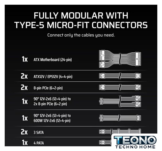 | Комплектация | - модульный кабель ATX (24-контактный) - 1 шт, 610 мм- кабель EPS/ATX 12В с 8 контактами (4+4) - 2 шт, 650 мм- кабель 12V-2x6 (12+4) - 1 шт, 650 мм- кабель PCIe с 8 контактами (6+2) - 2 шт, 650 мм- кабель SATA (4 SATA) - 3 кабеля, по 4 разъема на каждом, 800 мм- кабель PATA (4-контактный) - 1 кабель, 4 разъема, 750 мм |