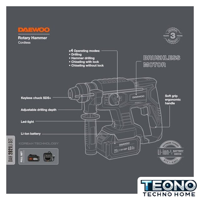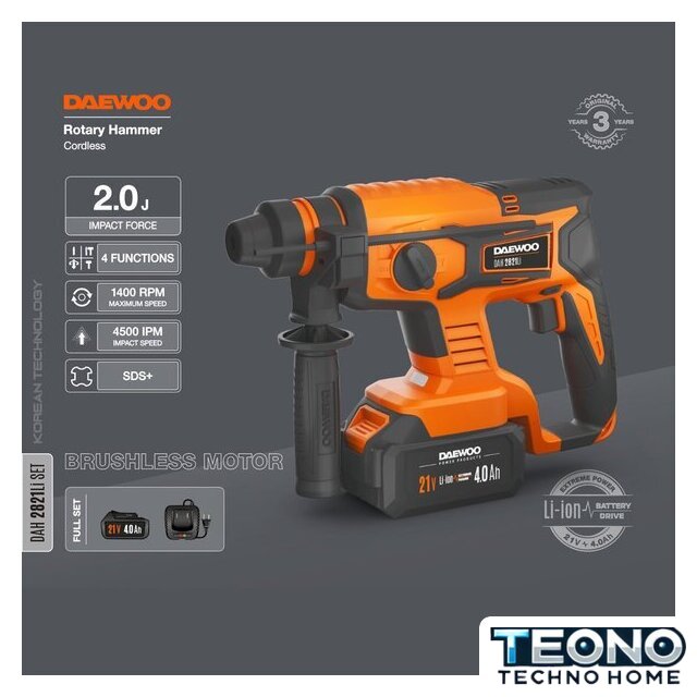 | Комплект поставки | - Перфоратор - 1 шт.- Аккумулятор 4,0 Ач - 1 шт.- Зарядное устройство - 1 шт.- Дополнителная рукоятка - 1 шт.- Буры 6, 8, 10 мм. - 3 шт.- Долото острое - 1 шт.- Долото плоское - 1 шт.- Инструкция- Кейс |
