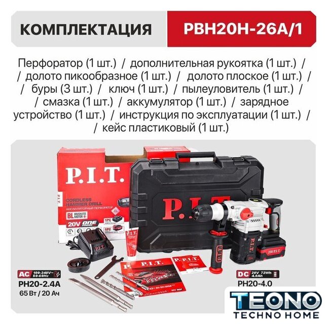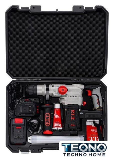 | Комплект поставки | - Перфоратор,, - аккумулятор (1 шт.),, - зарядное устройство,, - дополнительная рукоятка,, - долото пикообразное,, - долото плоское,, - буры (3 шт.),, - ключ,, - пылеуловитель,, - смазка,, - инструкция по эксплуатации,, - кейс. |