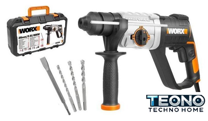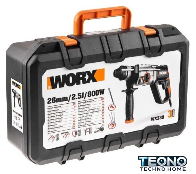 | Комплект поставки | - Перфоратор WORX WX339;- Дополнительная ручка;- Ограничитель глубины сверления;- 3 SDS сверла;- 1 SDS плоское зубило;- Пластиковый бокс. |