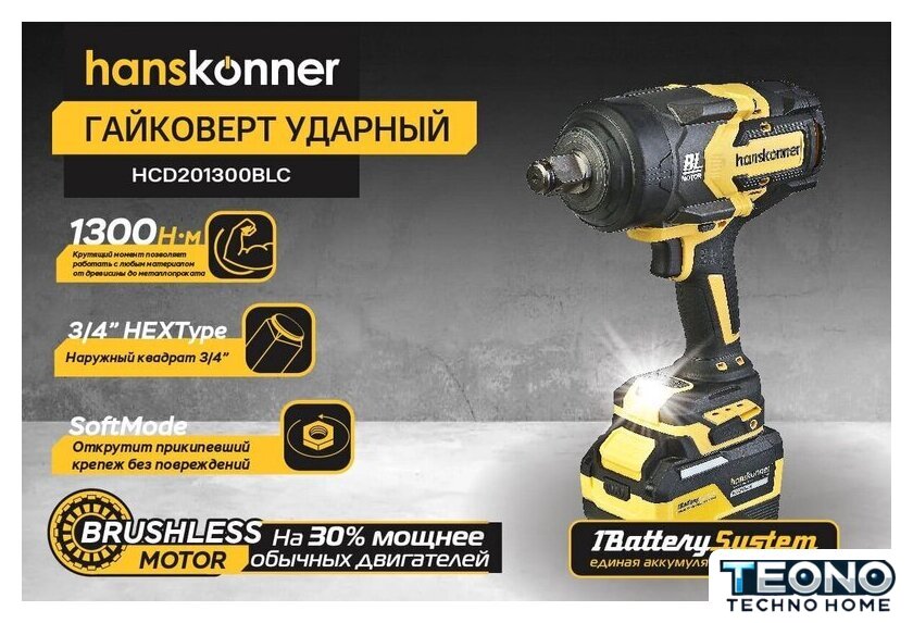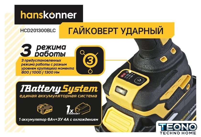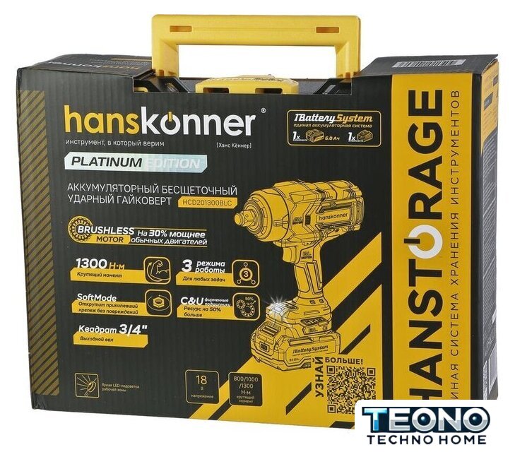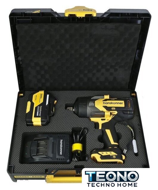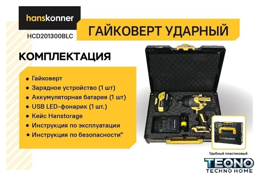 | Комплектация | - Гайковерт, - Зарядное устройство (1 шт), - Аккумуляторная батарея (1 шт), - USB LED-фонарик (1 шт.), - Кейс Hanstorage, - Инструкция по эксплуатации, - Инструкция по безопасности |