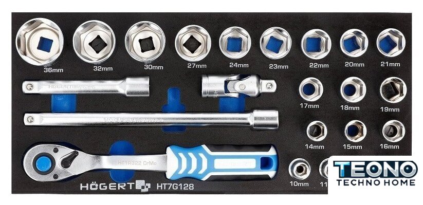 | Комплектация | - Торцевые головки: HT1A210 до HT1A236, - Трещотка 1/2": HT1R322, - Вороток 254 мм: HT1A727, - Удлинитель 1/2" 127 мм: HT1A724, - Шарнир 1/2": HT1A757 |