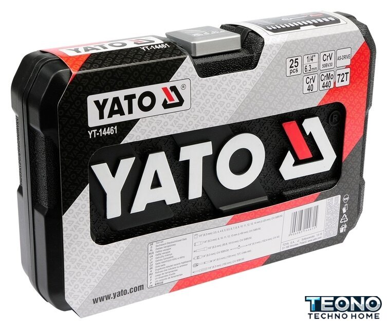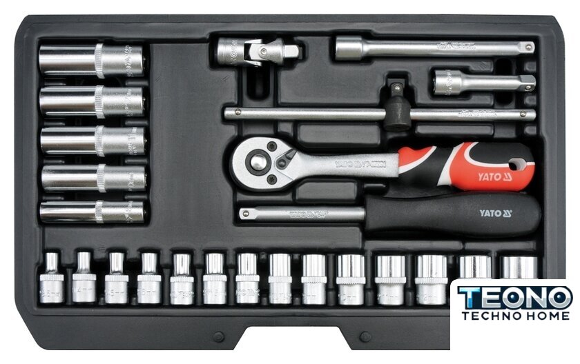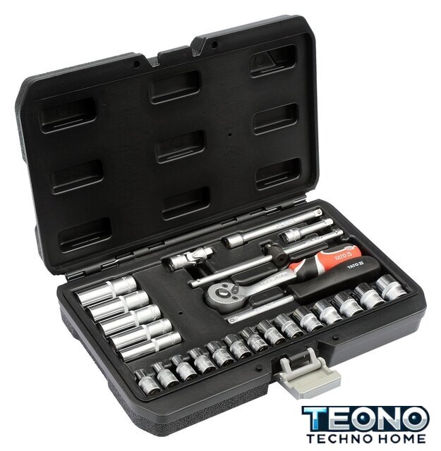 | Комплектация | - Торцевые головки 1/4": 3.5, 4, 4.5, 5, 5.5, 6, 7, 8, 9, 10, 11, 12, 13, 14 мм (L=25 мм);- Торцевые головки длинные 1/4": 8, 10, 11, 12, 13 мм (L=50 мм);- Удлинитель 1/4": 50 мм, 100 мм;- Трещотка: 72T, L= 155 мм;- Вороток тип T 1/4", L= 150 мм;- Универсальный шарнир 1/4";- Отвертка под квадрат 1/4". |