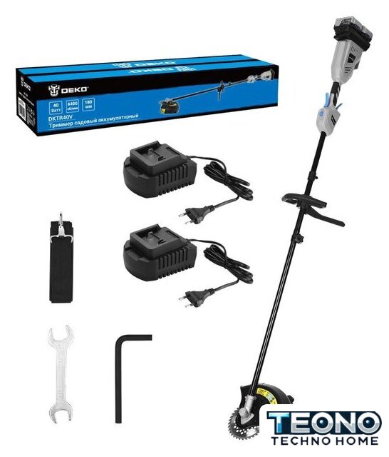 | Комплектация | Триммер (поставляется в частично разобранном виде: основной корпус, штанга, защитный кожух, рукоятка) – 1 шт.Аккумулятор 20В – 2 шт.Зарядное устройство – 2 шт.Ремень – 1 шт.Триммерная головка – 1 шт.Металлический диск – 1 шт.Гаечный ключ – 1 шт.Шестигранный ключ – 1 шт.Крепежный комплект - 1 шт.Руководство по эксплуатации – 1 шт.Коробка |