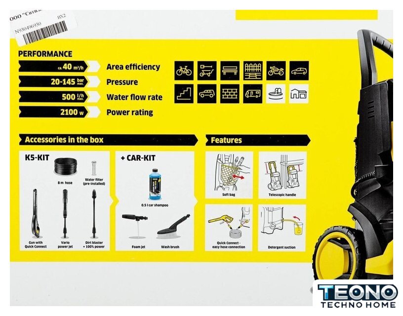 | Комплектация | - Комплект для мойки автомобиля (Car Kit): Щетка, пенное сопло, автомобильный шампунь, 0.5л- Пистолет: G 180 Q- Струйная трубка Vario Power- Грязевая фреза- Шланг высокого давления: 8 м- Адаптер для садового шланга A3/4" |