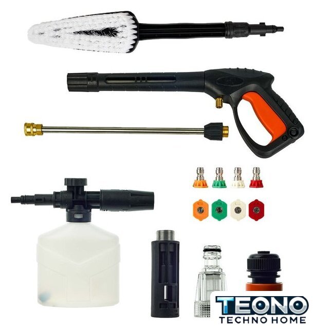 | Комплектация | 1. Корпус мойки высокого давления2. Ручка для перемещения3. Держатель моечного пистолета4. Колёса5. Пеногенератор6. Моечный пистолет7. Насадка-удлинитель для пистолета8. Шланг высокого давления для воды9. Комплект моечных фрез (4 шт)10. Быстросъёмные коннекторы для шланга11. Моечная щётка |