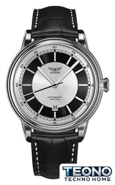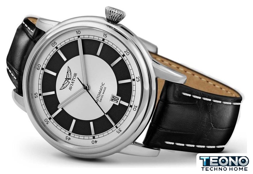 серебристый корпус, черный циферблат, кожаный ремешок