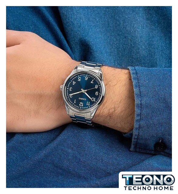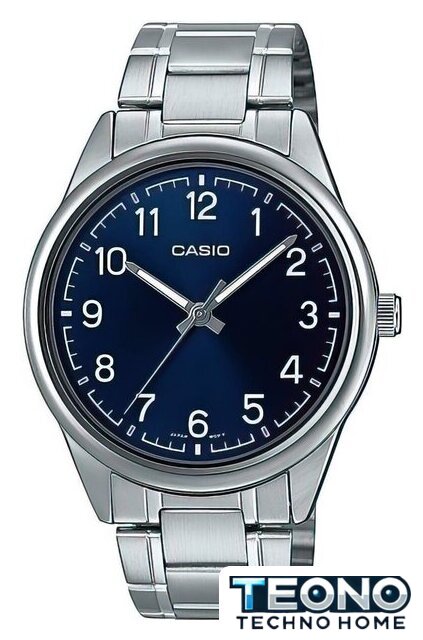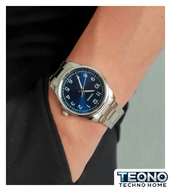 серебристый корпус, синий циферблат, металлический ремешок