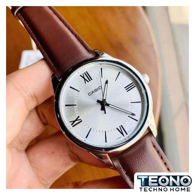 серебристый корпус, синий циферблат, коричневый браслет, кожаный ремешок