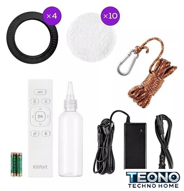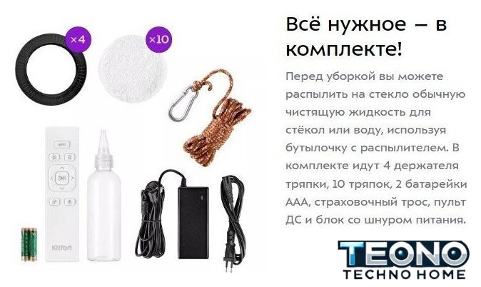 Комплектация - пульт ДУ, - документация, - сетевой кабель, - батарейки (2 шт.), - ткань для влажной уборки (10 шт.), - страховочный трос, - кольцо для салфеток (4 шт.), - флакон.