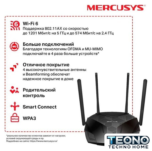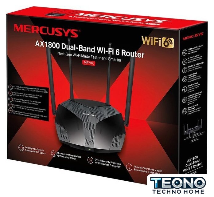 | Комплектация | • AX1800 Wi-Fi 6 роутер MR70X• Адаптер питания• Руководство по быстрой настройке• Кабель Ethernet RJ45 |
